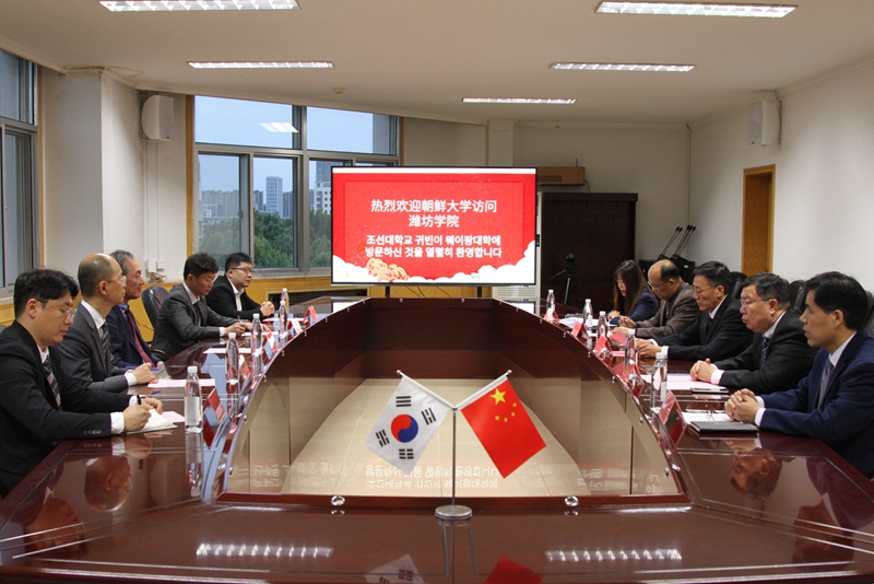 来逢波对闵渶敦一行表示热烈欢迎,并简要介绍了学校的办学概况、国际交流合作等情况。他表示,自2004年两校签订友好交流协议以来,多次开展学生交流活动,硕果累累。今年6月两校又签署了《潍坊学院与朝鲜大学联合培养研究生合作协议书》,目前已开展招生工作,必将进一步发挥两校优势资源,提高学生培养质量。