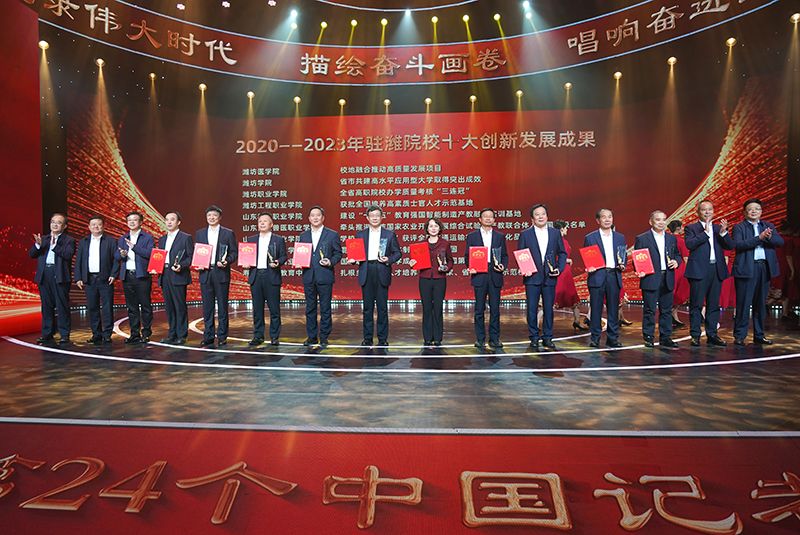 晚会现场揭晓了2020—2023年驻潍院校创新发展十大成果,学校报送的《省市共建高水平应用型大学取得突出成效》名列其中,刘运为我校颁奖。徐梅为2023年度潍坊市优秀记者颁奖。学校选送音乐学院舞蹈《厚土》向记者节献礼。