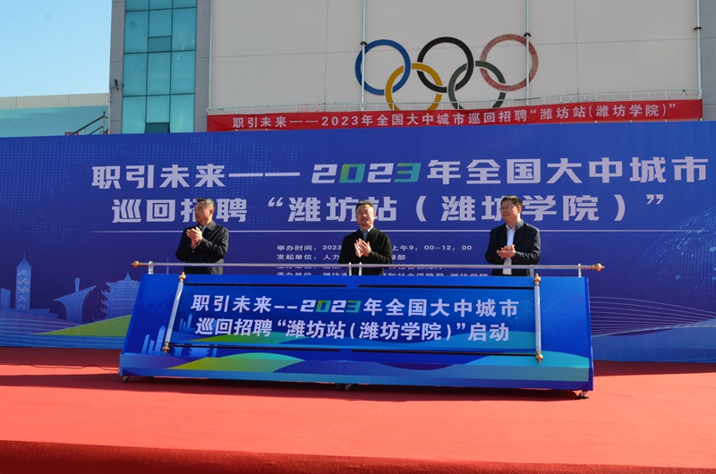 本网讯 为深入贯彻落实党的二十大精神和党中央、国务院关于促进高校毕业生就业的决策部署,千方百计促进高校毕业生高质量充分就业,11月10日上午,“职引未来—2023年全国大中城市巡回招聘‘潍坊站(潍坊学院)’”专场招聘活动在我校体育场成功举办。此次活动由人力资源和社会保障部发起,山东省人力资源和社会保障厅主办,我校和潍坊市人力资源和社会保障局联合承办。山东省公共就业和人才服务中心人力资源市场服务处副处长于东鹏,学校党委委员、副校长任立春、潍坊市公共就业和人才服务中心党委委员、副主任王金升出席本次活动。