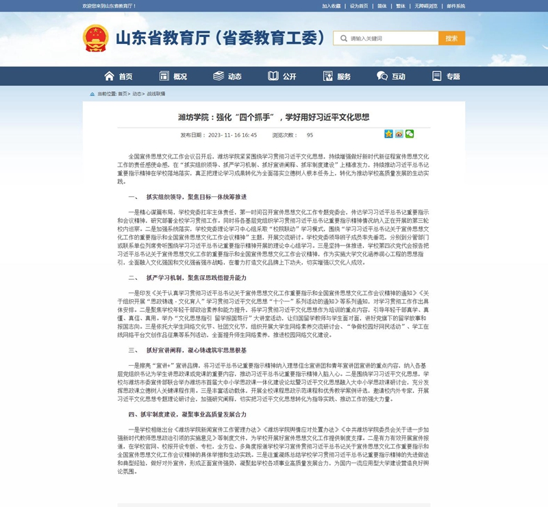 【编者按】山东省教育厅(省委教育工委)战线联播以《潍坊学院:强化“四个抓手”,学好用好习近平文化思想》为题,报道我校紧紧围绕学习贯彻习近平文化思想,在“抓实组织领导、抓严学习机制、抓好宣讲阐释、抓牢制度建设”上精准发力,持续推动习近平总书记重要指示精神在学校落地落实,真正把理论学习成果转化为全面落实立德树人根本任务、推动学校高质量发展的生动实践。