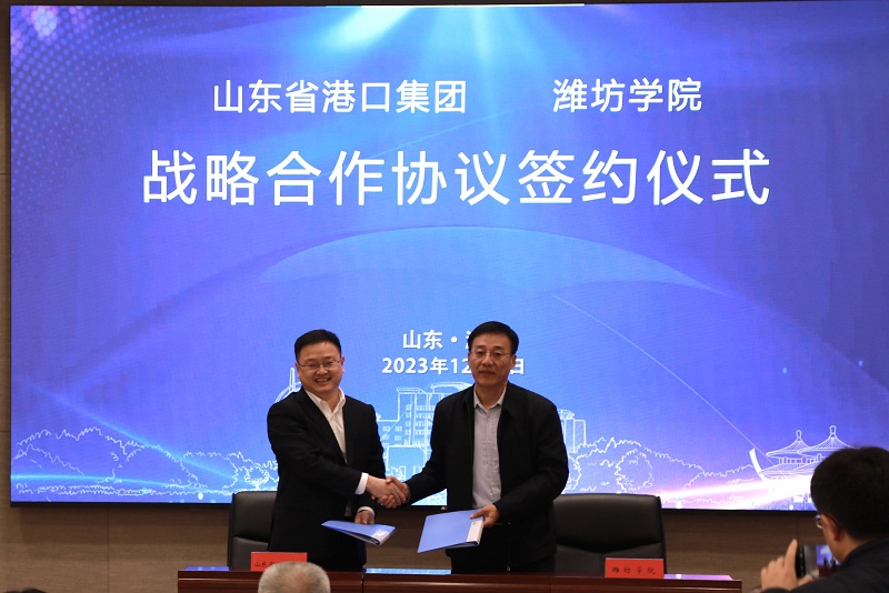 开幕式上,举行了潍坊学院与山东省港口集团战略合作协议签约仪式,来逢波和高亚分别代表双方签署了战略合作协议。
