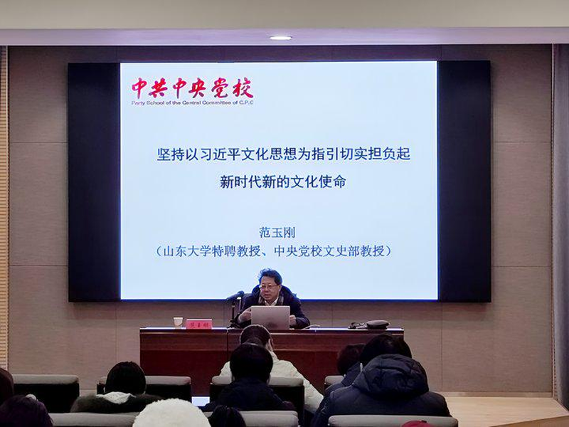 范玉刚主席从深刻把握习近平文化思想的重大意义与理论内涵、中国式现代化的文化形态、深刻把握中华传统文明的特性和创造属于我们时代的新文化四个维度,对习近平文化思想进行阐释和讲解。他指出,习近平文化思想科学阐释了文化的本质,强调以人民为中心的创作导向、坚持以人民为中心的文化工作导向,尊重人民的文化主体地位和保障人民的文化权益,有效增强了人民的精神力量。他强调,中华文明突出的连续性、创新性、统一性、包容性、和平性,是我们增强历史主动性的战略定力所在,更是中国崛起为世界大国的持久性力量之源。他希望大家要认真学习贯彻习近平文化思想,坚定文化自信,坚持以文化人,切紧时代脉搏,做到行稳致远,切实担负起新时代新的文化使命。