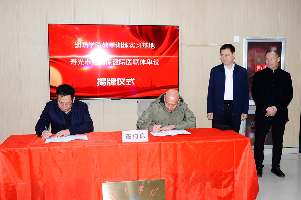 仪式上,任立春与高文浩为寿光市妇幼保健院医联体单位揭牌。体育学院负责同志与寿光市体育局负责同志为寿光新毅克运动康复医疗中心揭牌并签署体卫融合教学实践基地合作协议。