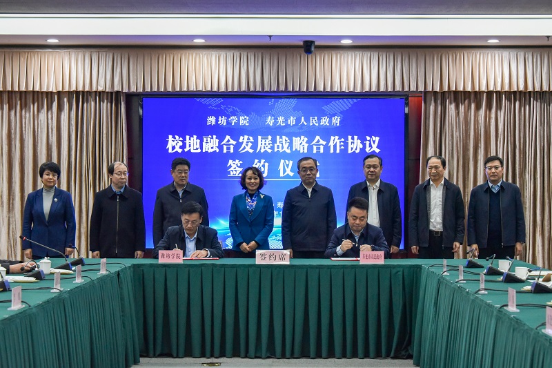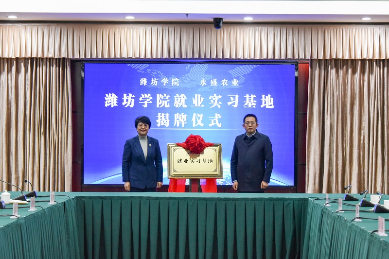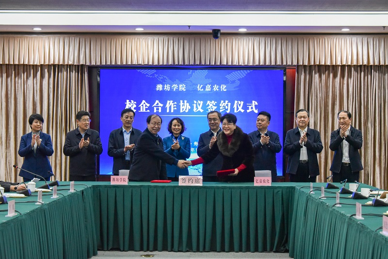 在签约仪式上,来逢波与赵天宝代表校地双方签署校地融合发展战略合作协议。李英德与山东亿嘉农化有限公司负责人禇爱玲签署校企合作协议,赵卫红与山东永盛农业发展有限公司董事长梁增文共同为“潍坊学院就业实习基地”揭牌。