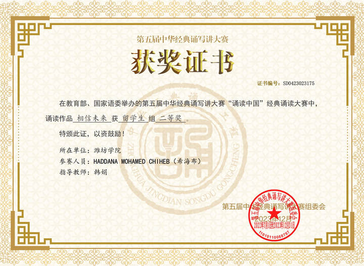 本网讯 近日,中华经典诵写讲大赛组委会公布了第五届中华经典诵写讲大赛获奖名单,我校国际学生希海布的诵读作品《相信未来》荣获“诵读中国”经典诵读大赛留学生组二等奖,这也是山东省留学生组唯一的国赛总决赛获奖作品。