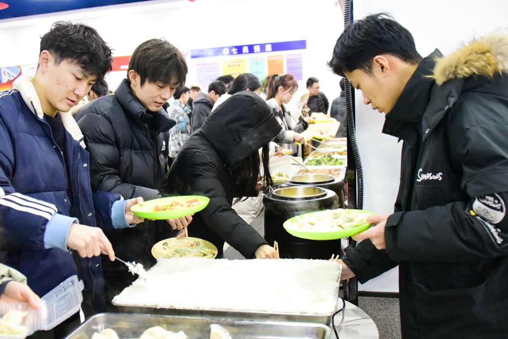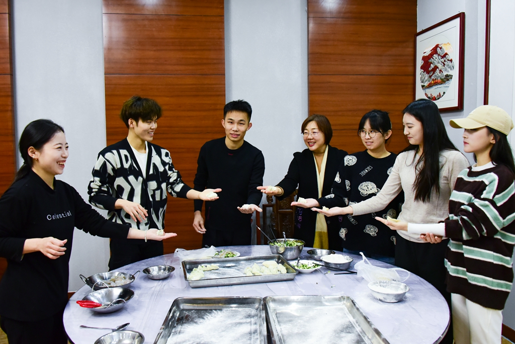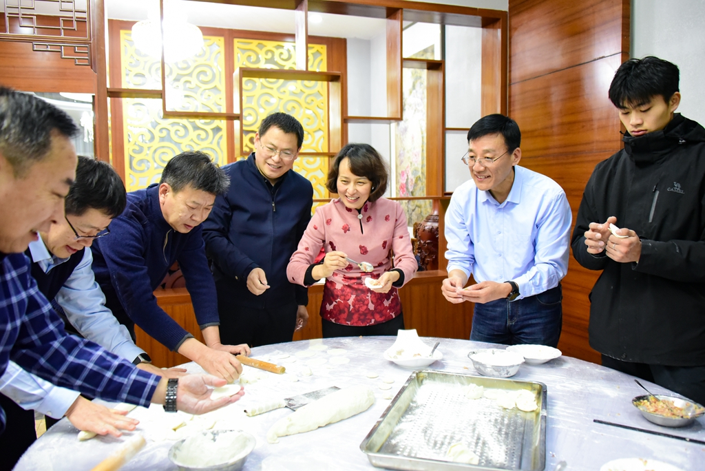 本网讯 “玉兔辞旧岁,祥龙迎新年。”新春佳节即将来临,为做好寒假期间留校学生的服务与保障工作,确保学生度过安全健康、温馨祥和的假期,1月31日下午,学校党委书记徐梅,党委副书记、校长来逢波,党委委员、副校长任立春及相关部门教职工这些特别的“家长”们,与留校学生欢聚一堂,一起包饺子、吃年饭,让留校学生们体会到“在校如在家”的浓浓年味。