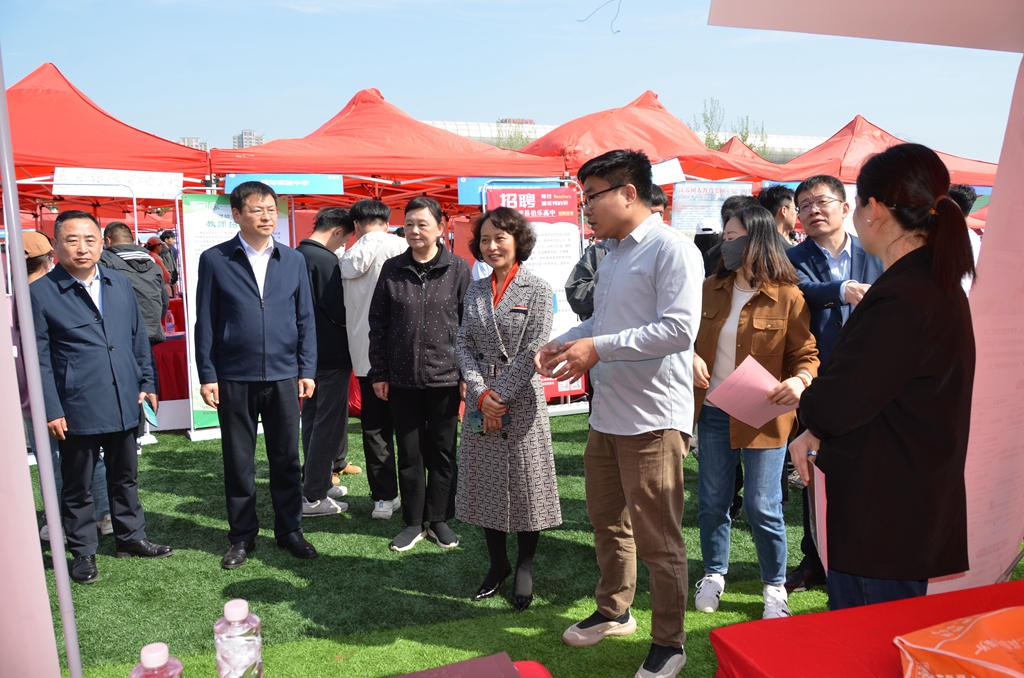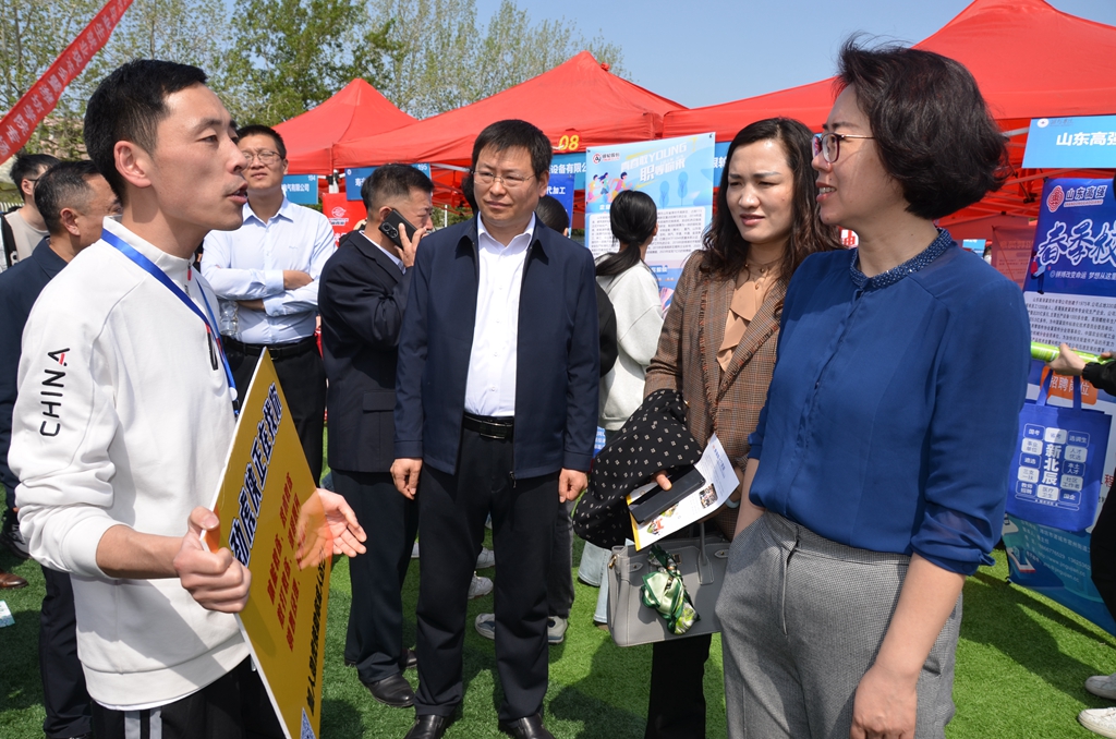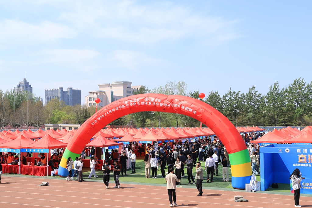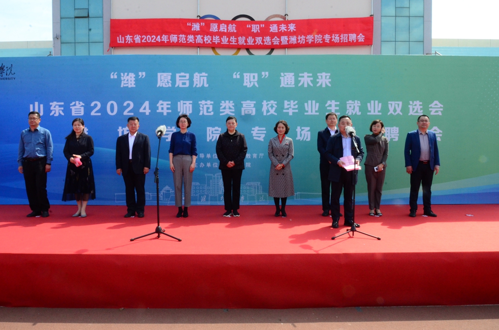 本网讯 4月12日,由山东省教育厅主办、我校承办的“‘潍’愿启航 ‘职’通未来”山东省2024年师范类高校毕业生就业双选会在学校体育场举行。山东省教育厅高等学校学生处二级调研员任永红,潍坊市教育局党组副书记、市委教育工委副书记王妍妮,潍坊市公共就业和人才服务中心党委委员、副主任秦志伟,学校党委书记徐梅,党委委员、副校长任立春到现场指导工作。
