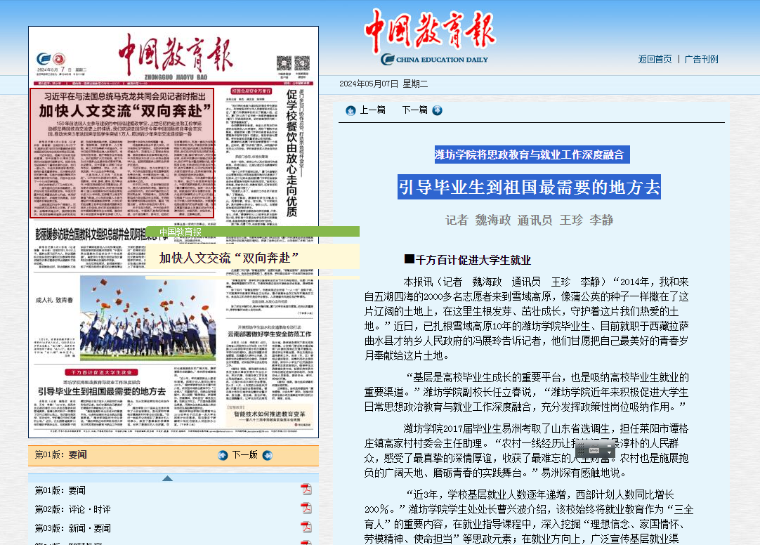本网讯 5月7日出版的《中国教育报》头版“千方百计促进大学生就业”专栏,以《潍坊学院将思政教育与就业工作深度融合--引导毕业生到祖国最需要的地方去》为题,报道了近年来我校在基层就业方面的工作经验,对我校就业工作成果给予充分肯定。