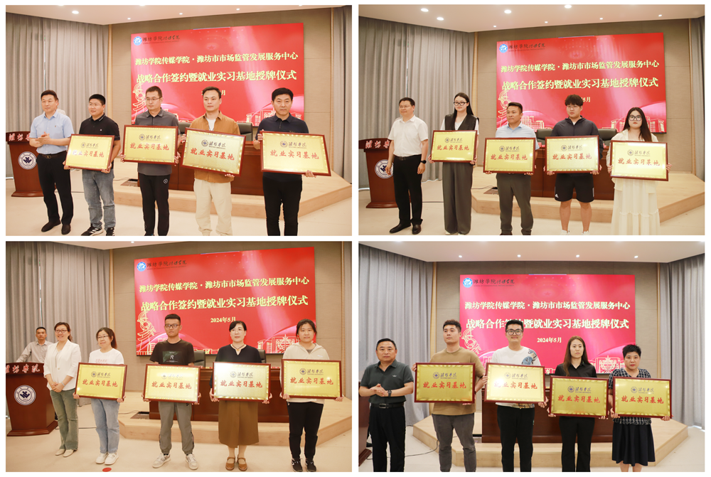仪式上,与会领导分别为16家企业授“潍坊学院就业实习基地”牌。传媒学院负责同志与潍坊市市场监管发展服务中心主任范伟代表双方签署战略合作协议。