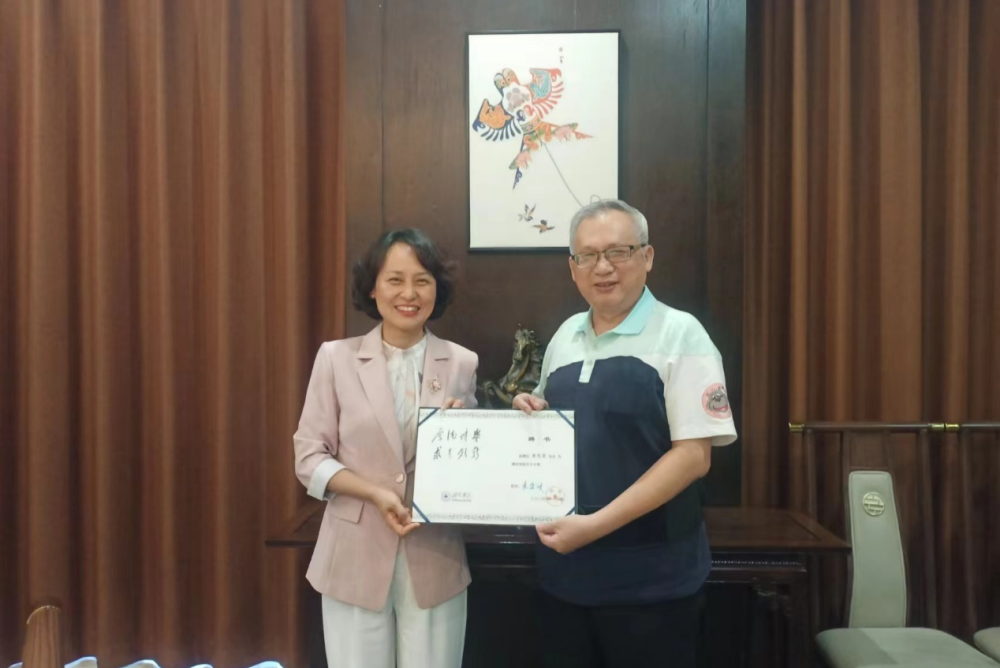 徐梅为黄茂荣、吴胜儒颁发客座教授聘书。