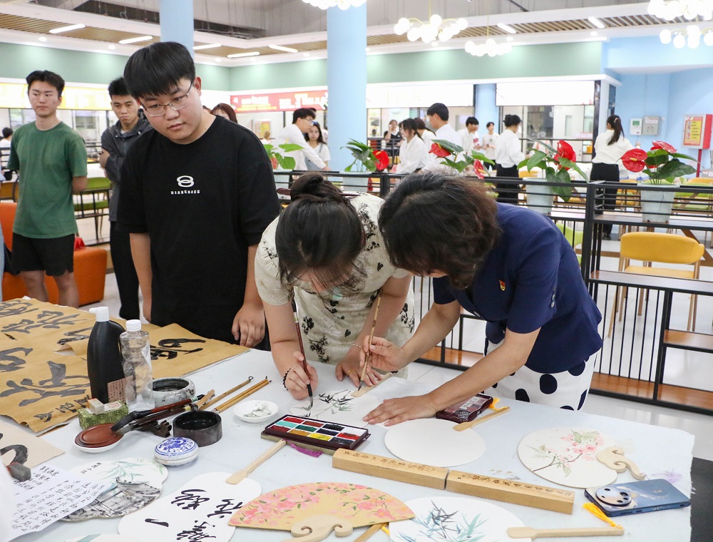 在现场书画展示环节,师生齐聚一堂,纷纷挥毫泼墨,展示书法技艺。墨香四溢,一幅幅精美的书法作品逐渐成形。这些作品是师生们情感的流露和思想的传递,更是属于潍院师生共同的美好回忆。