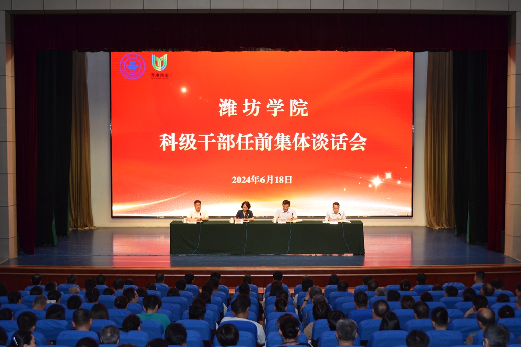 本网讯 6月18日,学校召开科级干部任前集体谈话会。学校党委书记徐梅出席并讲话,党委副书记、校长来逢波主持会议,党委副书记王守全出席会议,党委委员、纪委书记,省监委驻潍坊学院监察专员武玉杰进行廉政谈话。