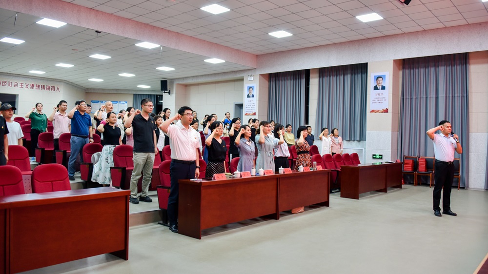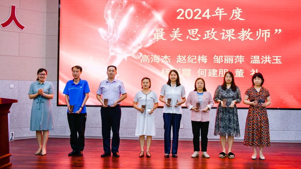 会上,马克思主义学院负责人宣读了“最美思政课教师”、教学技能“大比武”、高水平教研贡献奖、高水平科研贡献奖表彰名单。宣传部、教务处、马克思主义学院负责人为获奖团队及个人颁奖。两位教师代表分别作了交流发言,分享了他们在思政课教学与科研工作中的心得体会。随后,全体党员教师重温入党誓词,表达了对党的忠诚。