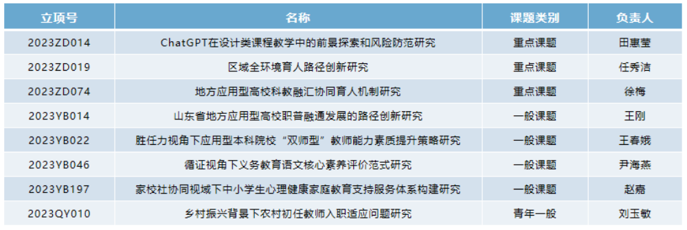 本网讯 近日,山东省教育科学规划领导小组办公室公布山东省教育科学“十四五”规划2023年度课题立项名单,学校8个项目名列其中。其中重点课题3项,一般课题4项,青年一般课题1项,立项数量创历史新高。