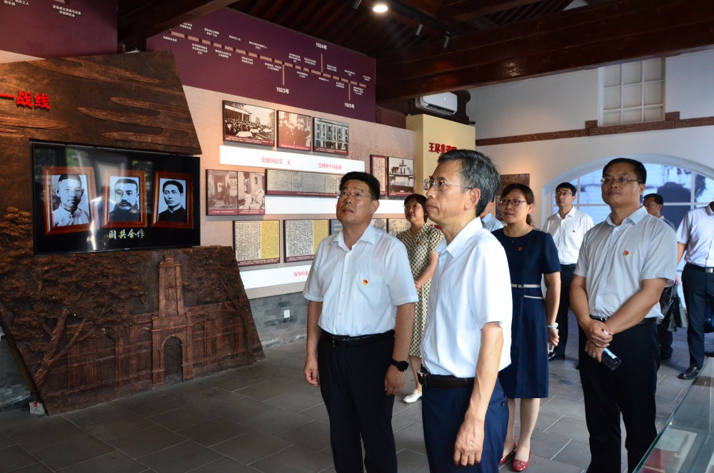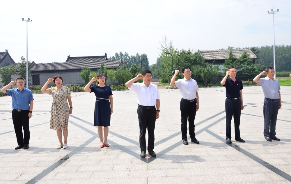 在教学基地,王守全带领学校参加会议人员,面向鲜红的党旗,庄严肃立,重温入党誓词,使大家进一步坚定理想信念,强化使命感和责任感。在讲解员的带领下,大家怀着敬仰肃穆之情走进王尽美烈士纪念馆,参观多个主题陈列室,通过视频、历史照片、陈列实物回顾了王尽美辉煌的革命生涯,以及为党的创建和革命活动作出的卓越贡献。大家在王军引导下,瞻仰王尽美同志故居,了解王尽美年少时的生活场景,切身感受他成长的环境和氛围,深刻体悟他救国救民的革命情怀。