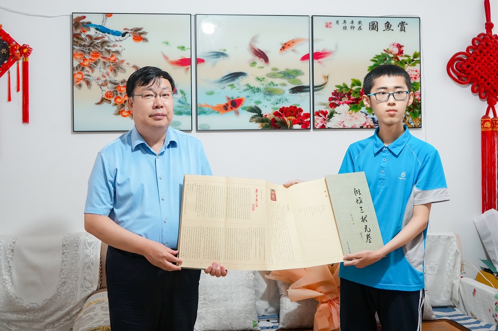 王成端代表学校向张文政及家人表示祝贺,送上我校老教授张克云翻译的《潍坊三状元卷》,鼓励张文政以师长和前辈们为榜样,勤奋刻苦学习,提前做好学业和职业生涯规划,争取在潍院获得更大的成长与进步。