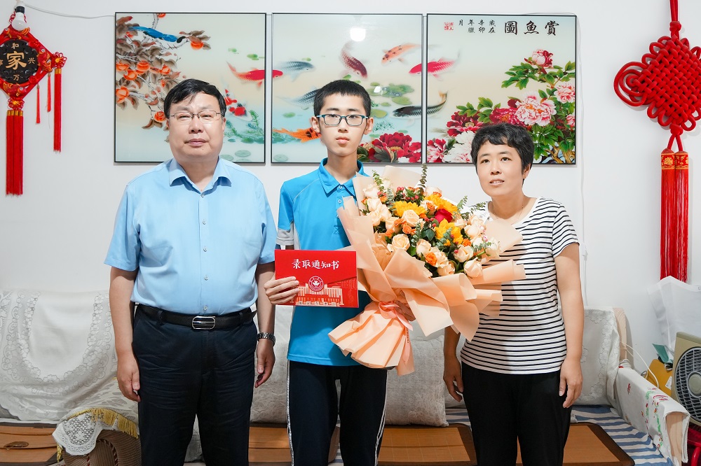 本网讯 潍坊学院录取工作正在有序进行,截至目前,第一批录取通知书已经准备完毕。为让新生第一时间体验收到录取通知书的喜悦,8月2日,学校党委委员、副校长王成端将学校2024年首封录取通知书送至新生张文政家中。