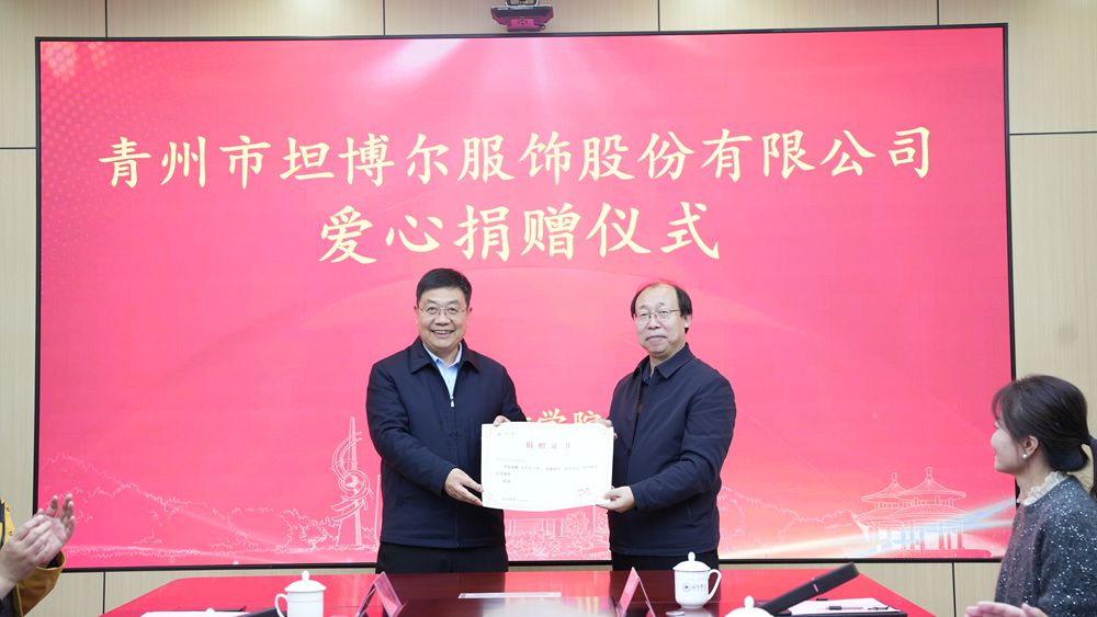 捐赠仪式上,李英德表示,坦博尔作为著名的现代服装企业不仅拥有智能化的制造工艺和一流的产品,更具有强烈的社会责任感和深厚的人文关怀,彰显了企业与社会同呼吸、共命运的担当精神。坦博尔是学校企合作的重点企业,在科研、管理、设计、营销、新媒体等多个方面为我校的人才培养提供了丰富资源。相信在坦博尔爱心力量的带动下,会有更多的温暖与希望在校园中传递,助力更多学子迈向更美好的未来。