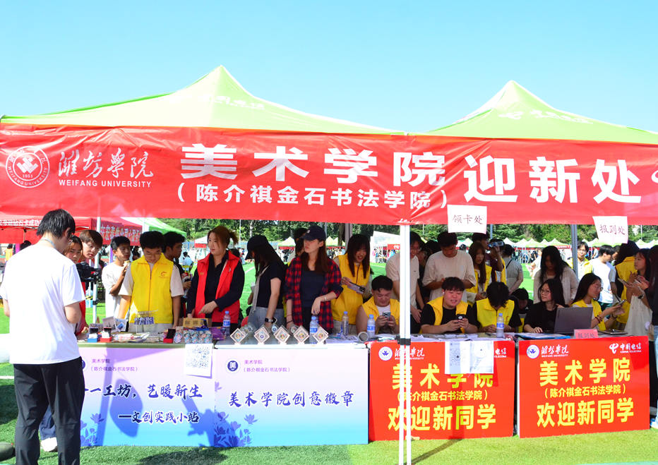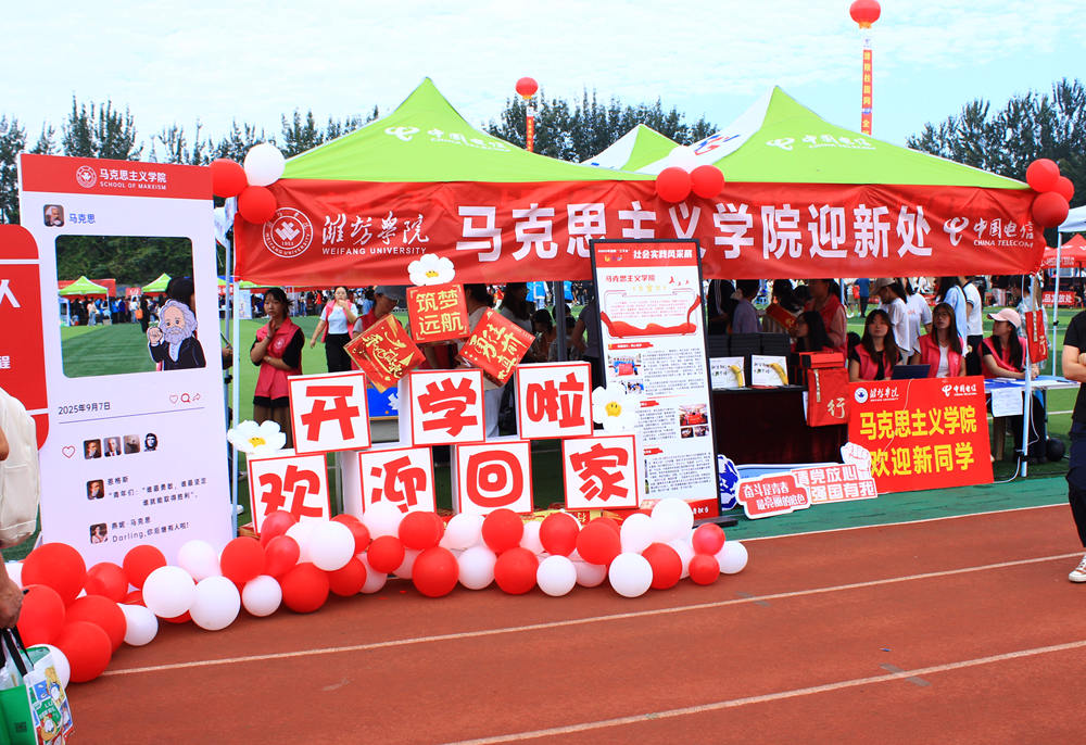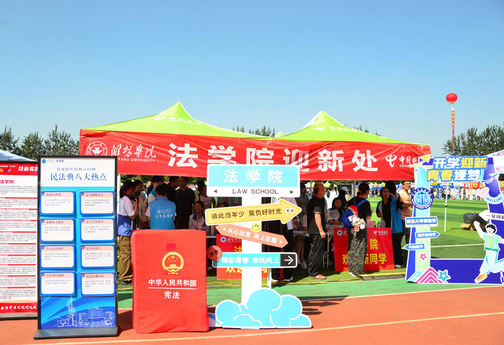 各学院也结合专业特色,打造了独具风格的迎新活动,其中法学院以“法”为核心,设置法学蓝主题签名墙,打造包含法官袍、法槌模型及迷你版《民法典》的沉浸式打卡区,并准备“法小豸”特色周边,彰显专业魅力;外国语学院组织新生挑选并签名300块拼图,共同拼装成世界地图展板,既象征学子汇聚一堂,也寓意新生将以国际视野开启大学篇章;现代农学院围绕“新农人・新起点・新丰收”理念,通过“丰稷门”入园仪式、赠送含农元素的清凉礼包、开展“绘农韵・留印记”老生手写祝福及“希望”麦穗信封等活动,将专业特色与人文关怀深度融合,给新生留下深刻的“潍院初印象”。