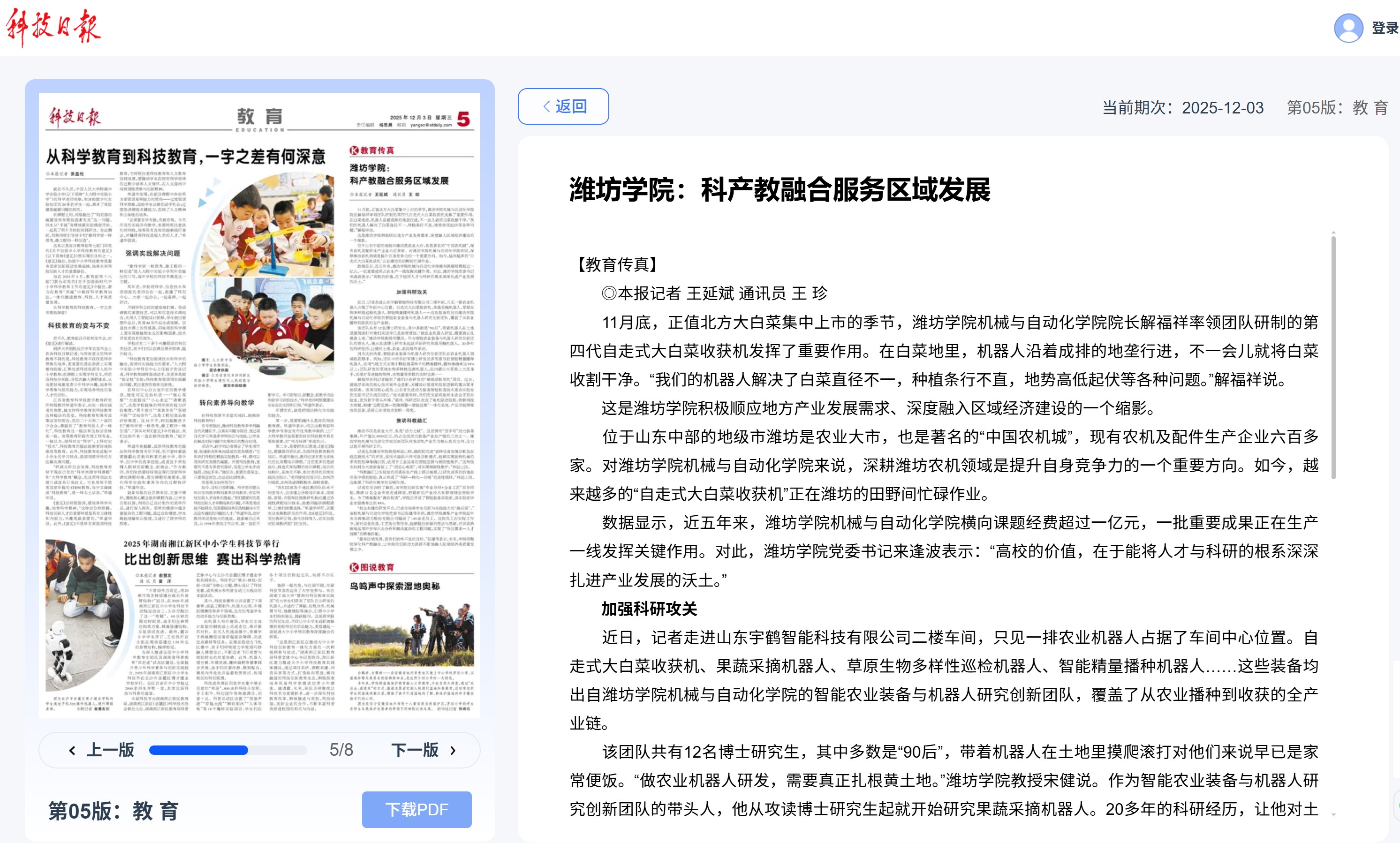 本网讯 12月3日,《科技日报》以《潍坊学院:科产教融合服务区域发展》为题,对学校不断深化科教产融合,服务区域经济发展的经验做法进行了报道。