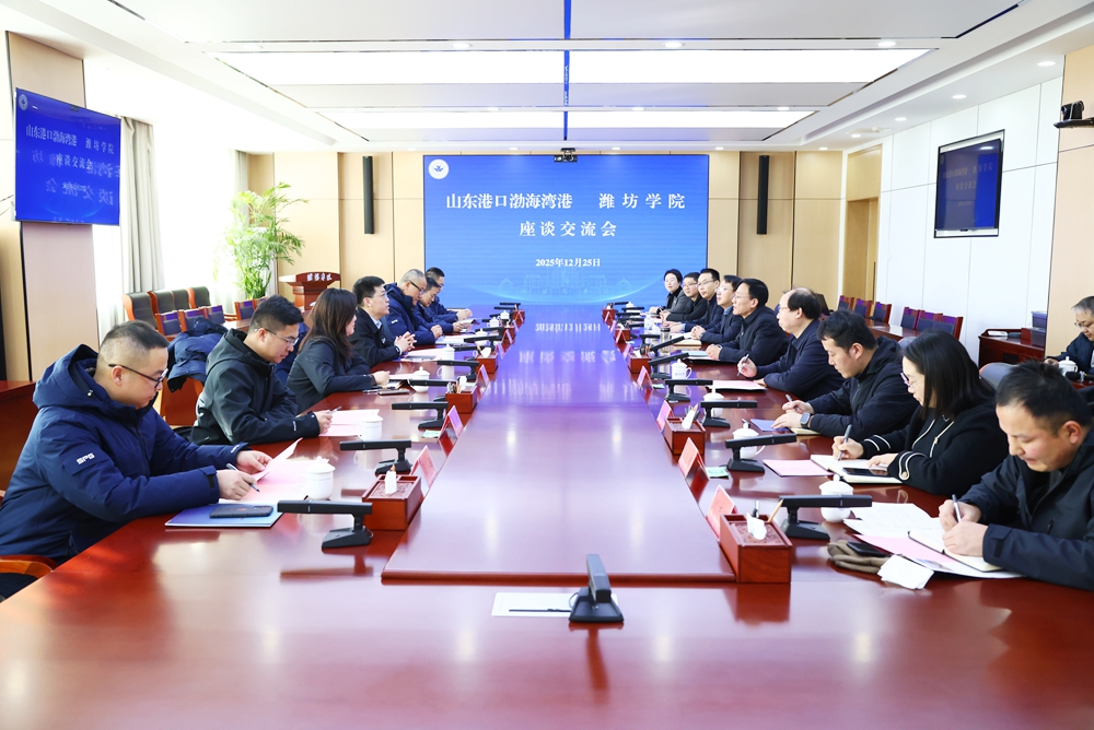 王玉福对学校在服务区域经济社会发展中取得的成绩表示赞扬。他介绍了山东港口渤海湾港集团的发展布局、业务板块、智慧绿色港口建设的核心需求,以及潍坊港国际物流大通道建设暨5万吨级航道工程,对我校此前在潍坊市重点实验室及产学研合作中给予的支持表示感谢。他希望学校充分发挥科研与人才优势,双方进一步拓宽合作维度、提高合作层次,推动科研成果加速转化落地,实现校企互利共赢。