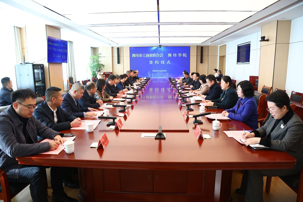 本网讯 12月30日,学校与潍坊市工商业联合会(以下简称“市工商联”)举行全面合作框架协议签约仪式。潍坊市人民政府副市长、市工商联主席陈端梅,学校党委书记来逢波出席活动并致辞。学校党委副书记、校长王霞主持活动。潍坊市人民政府办公室副主任赵昌丽,潍坊市委统战部副部长、市工商联党组书记、常务副主席刘兴成,学校党委委员、副校长李英德出席活动。