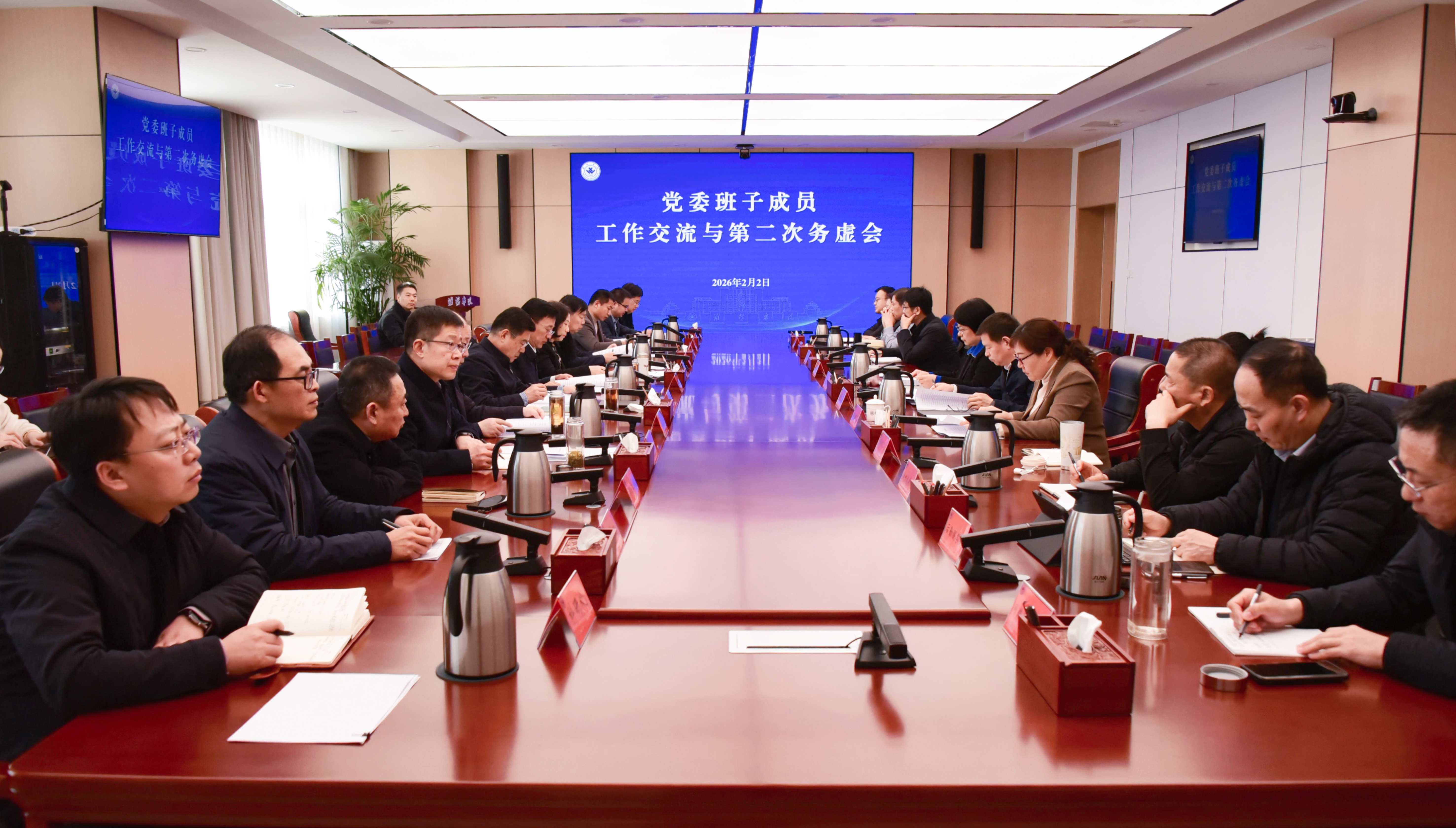 本网讯 2月2日,学校召开党委班子成员2026年第二次务虚会,聚焦学校重点工作推进,研判发展形势,理清工作思路,凝聚发展共识,为高质量推进学校各项事业发展、科学谋划后续工作奠定坚实基础。学校党委书记来逢波主持会议并作总结讲话,党委班子成员出席会议。